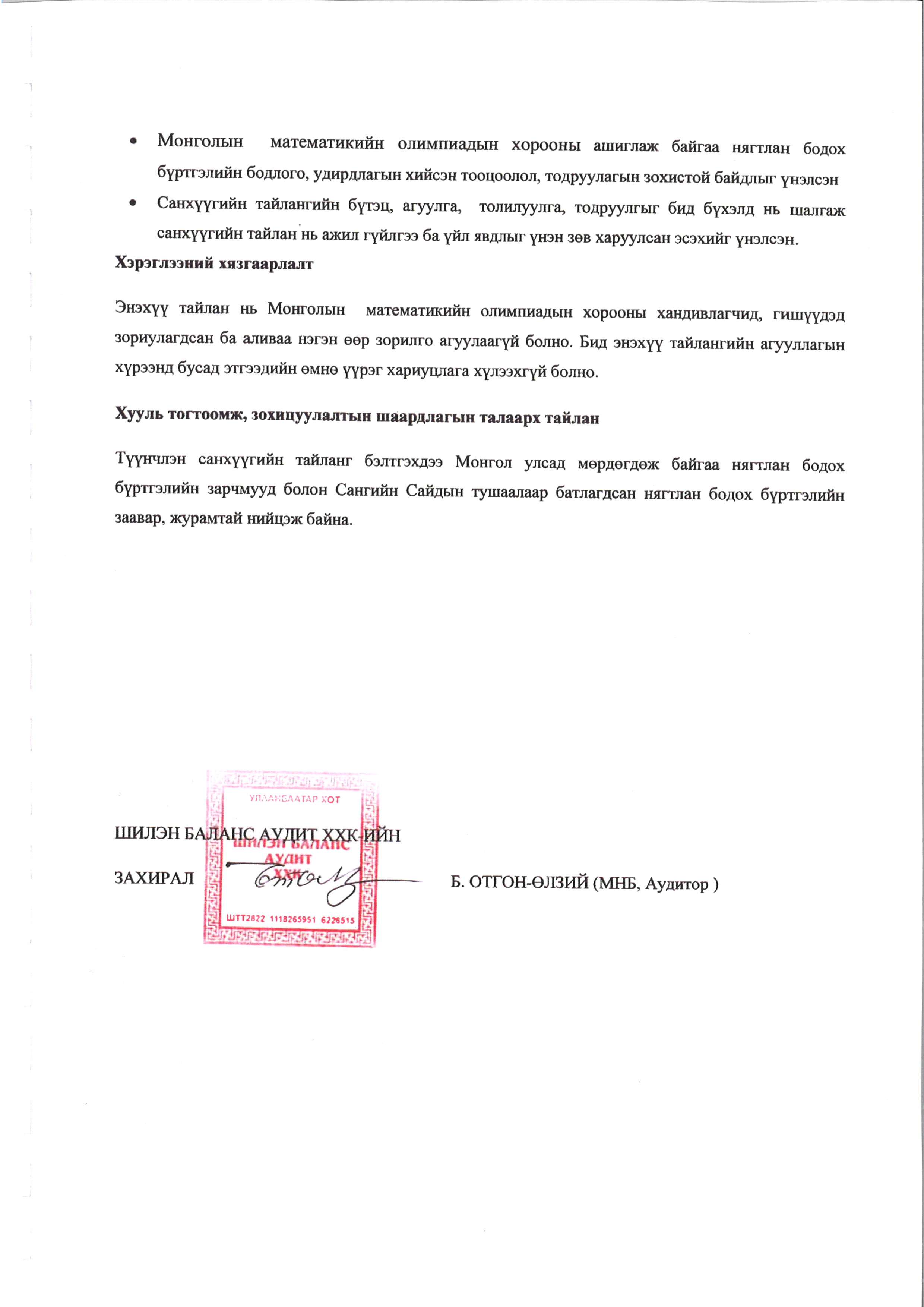 Улсын математикийн 54-р олимпиадын бодлогуудын бодолтыг цэгцлэх, орчуулах, редакторлах зардалд 900.000₮-ийн санхүүжүүллээ.