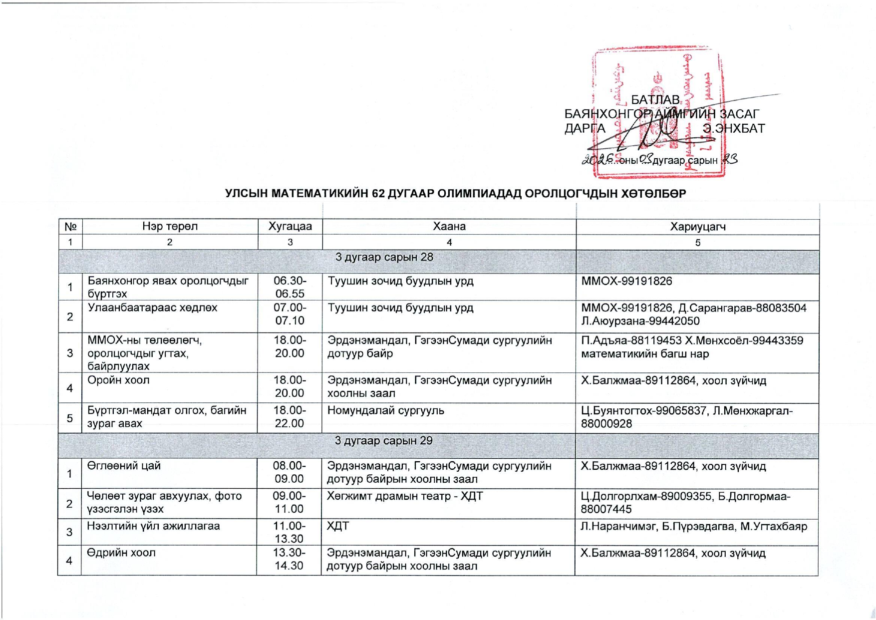 Улсын математикийн 62-р олимпиадын хөтөлбөр