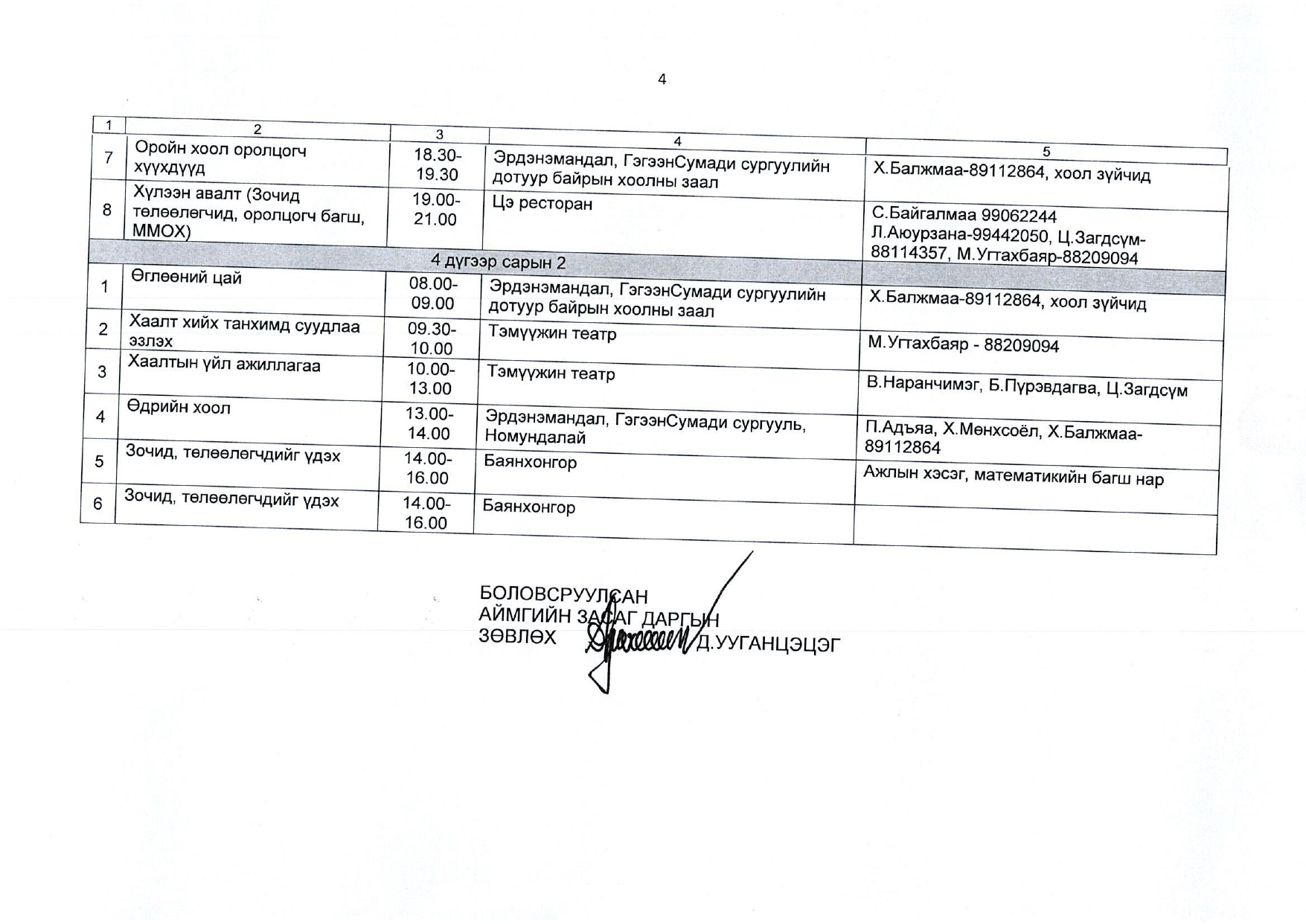 Цаг: 9:00-13:30 (8:30 гэхэд суудлаа эзэлсэн байна)