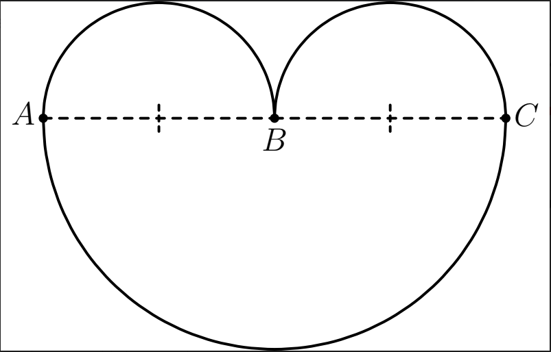Дараах зурагт үзүүлсэн $AB$, $BC$, $AC$ диаметртэй хагас тойргуудыг зүрх гэж нэрлэе. (Энд $AC$-ийн дундаж нь $B$ цэг байна.) $\omega$ зүрх өгөгджээ. Хэрэв $\omega$ дээр орших $P$, $P'$ цэгүүдээр түүний периметр хагаслан хуваагдаж байвал $(P,P')$-ийг бисектор гэж нэрлэе. $(P,P')$, $(Q,Q')$ нь бисекторууд байг. $\omega$-ийн $P$, $P’$, $Q$, $Q’$ цэгүүдэд татсан шүргэгч шулуунууд $XYZT$ гэсэн гүдгэр дөрвөн өнцөгт үүсгэнэ. Хэрэв $XYZT$ дөрвөн өнцөгт тойрогт багтсан бол $PP’$ болон $QQ’$ шулуунуудын хоорондох өнцгийг ол.