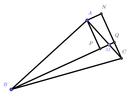 $CM$ цацрагийн үргэлжлэл дээр $\angle ANC=90^\circ$ байх $N$ цэг авбал \[AN=PQ,\quad CN=AP+CQ\] байна.