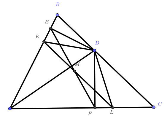 $ABC$ гурвалжны $BC$ тал дээр $D$ цэгийг $AD=2BD$ байхаар авч болдог байв. $D$ цэгээс $AB$ шулуун руу буулгасан перпендикулярын суурийг $E$, $AC$ шулуун руу буулгасан перпендикулярын суурийг $F$ гэе. $D$ цэгийг дайрсан $BC$ шулуунтай перпендикуляр шулуун $EF$ хэрчимтэй $M$ цэгт огтлолцоно. $M$ цэгийг дайруулан $BC$ шулуунтай параллел шулуун татахад $AB$ талыг $K$ цэгт, $AC$ талыг $L$ цэгт огтолж байв. $DL=2BK$ гэж батал.